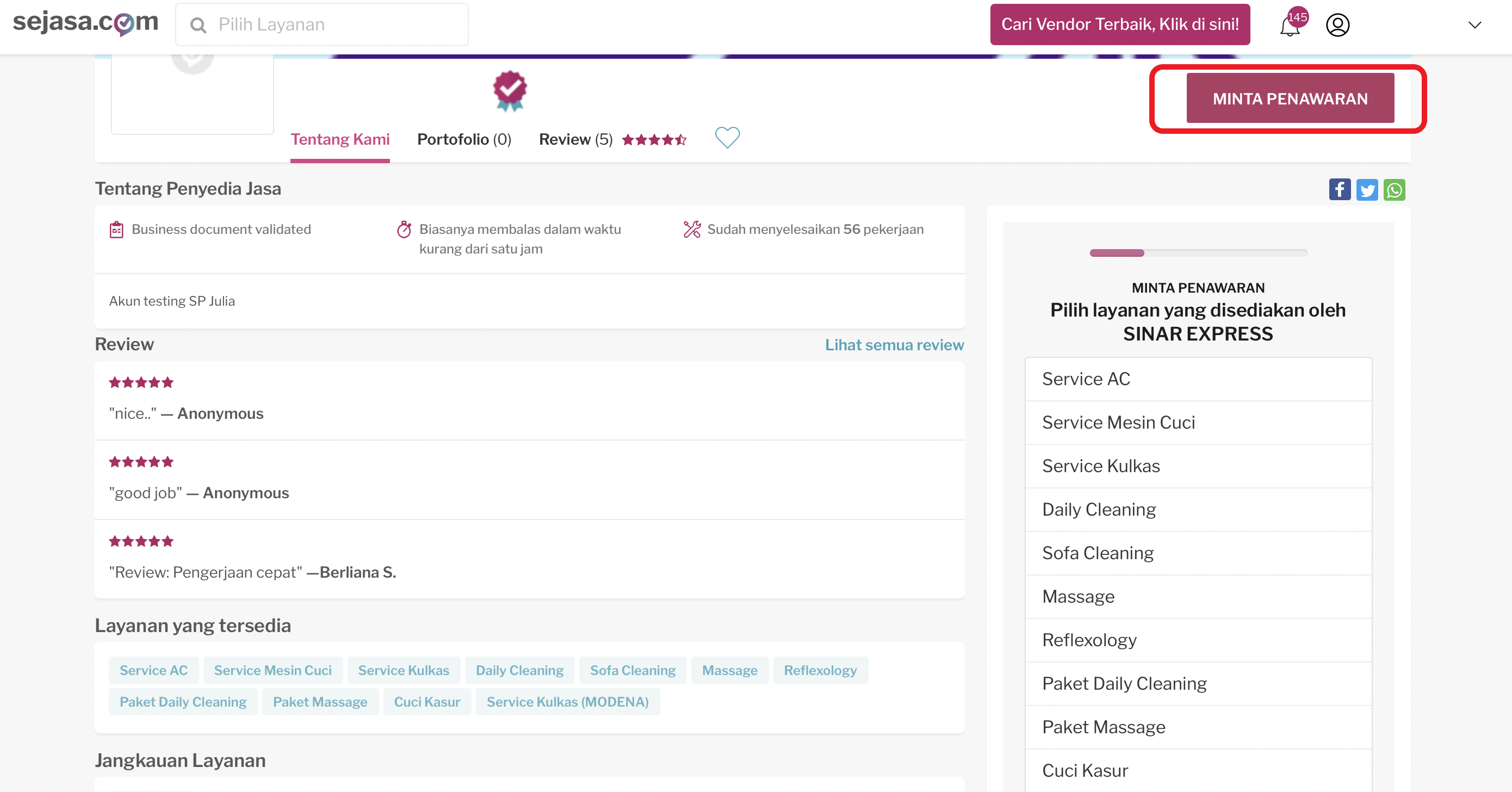 1. Customer mendapatkan link dari penyedia jasa. Pada bagian kanan, klik tombol Minta Penawaran.